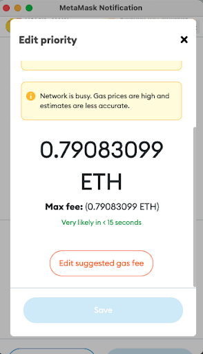 Then click ‘Edit suggested’ gas fee and the window below will open. Set the Gas Fee to Medium (recommended) and click Save.